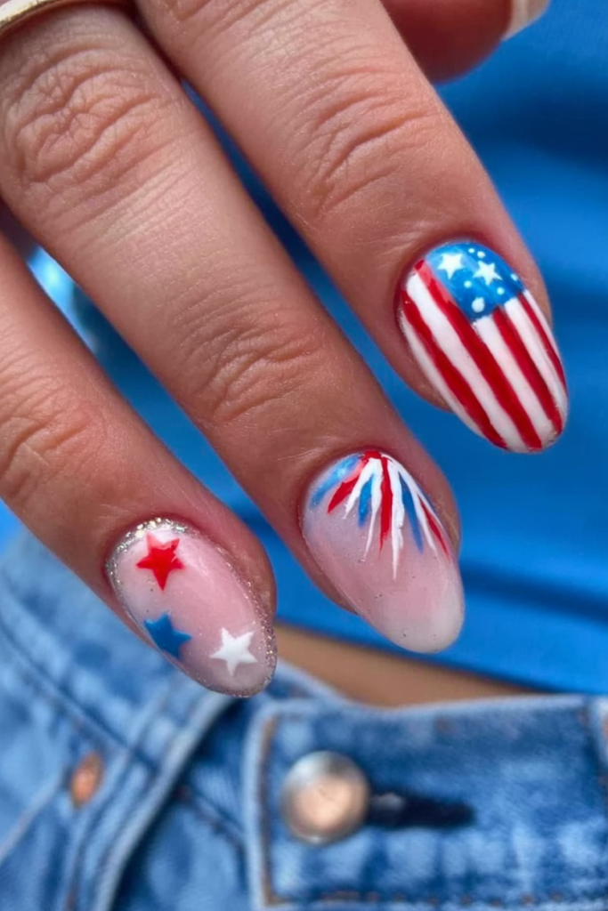 This sweet oval nail shape design gives off youthful charm with hand-painted stars, a mini flag, and soft glitter gradients. The natural nails base is elevated with bursts of red, blue, and white in easy, wearable art. Ideal for casual get-togethers, this set matches well with a denim skirt, white sneakers, and a tied-up tee.