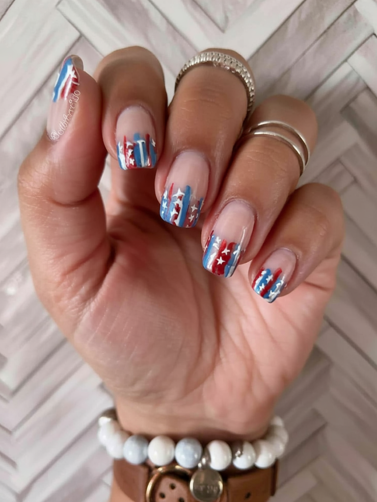 If you love dip nails with a soft artistic twist, this subtle brushstroke-inspired look hits the mark. Featuring fragmented stars, stripes, and layered vertical patterns in red, white, and blue, this design short set feels modern yet unmistakably patriotic. Works beautifully with an oversized chambray shirt and cuffed jeans.