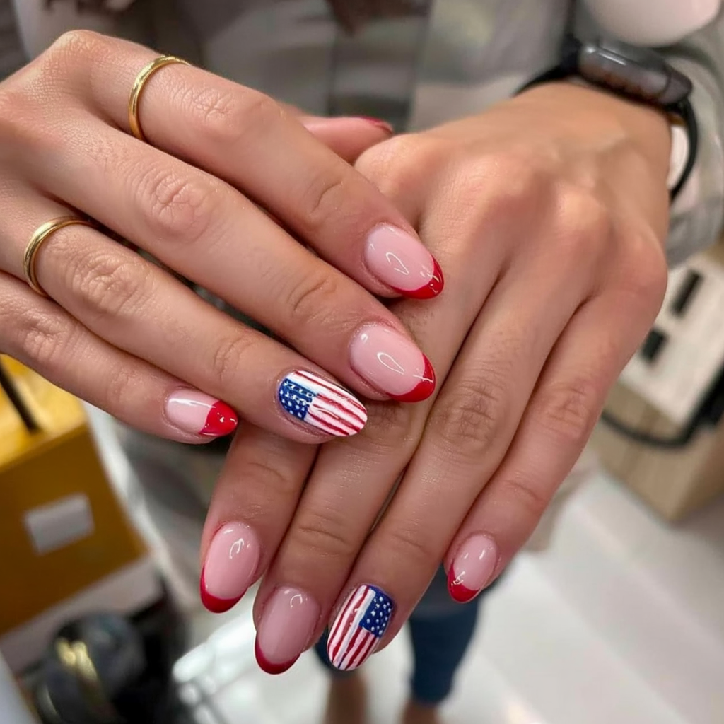 For lovers of minimalist elegance, this 4th of July french tip with a twist brings polish to patriotism. Subtle red tips paired with accent nails displaying miniature flags on a gel nails base creates a classy, office-friendly finish. Go for a structured tote and nude pumps to complete the look.