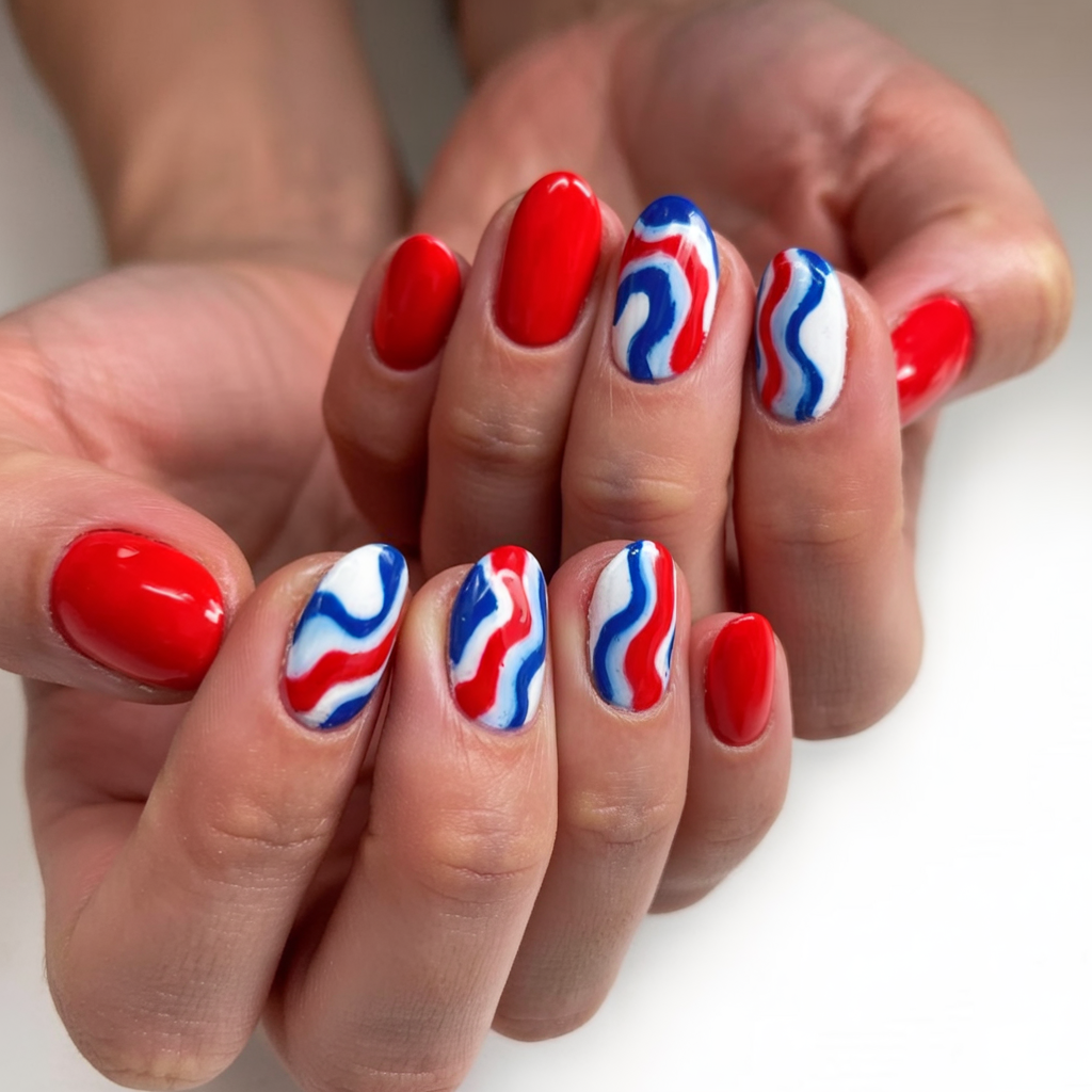 Swirls of red, blue, and white across a round nail shape make this design a standout. This is a go-to for women who love diy freedom—literally and figuratively. The design simple swirly lines give vintage vibes, perfect with a graphic tee and bell-bottom jeans for a carefree Americana feel.