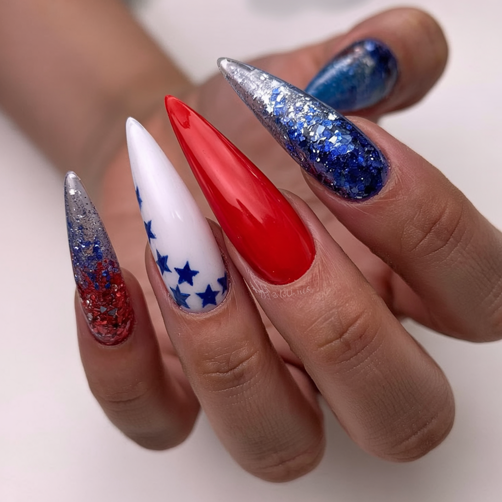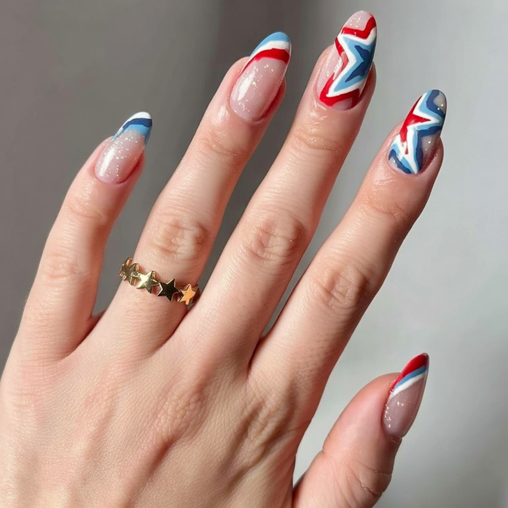 This graphic-forward nail art design plays with bold star outlines and neon stripes, combining clear bases and subtle shimmer. The almond nail shape adds elegance while the red, white, and blue palette ensures your patriotism sparkles. A perfect match for a moto jacket and high-waisted white jeans.