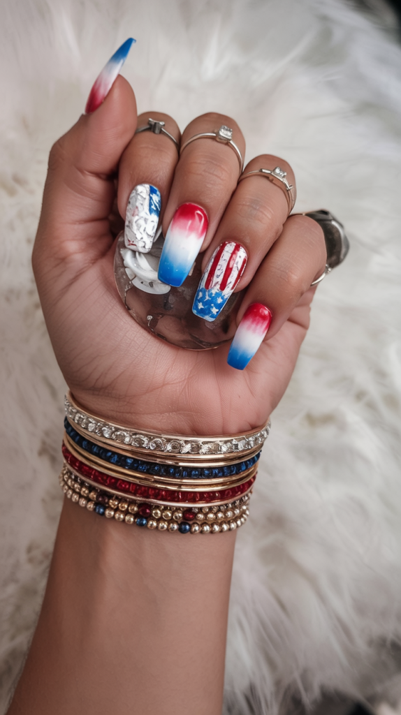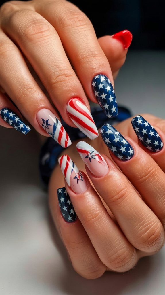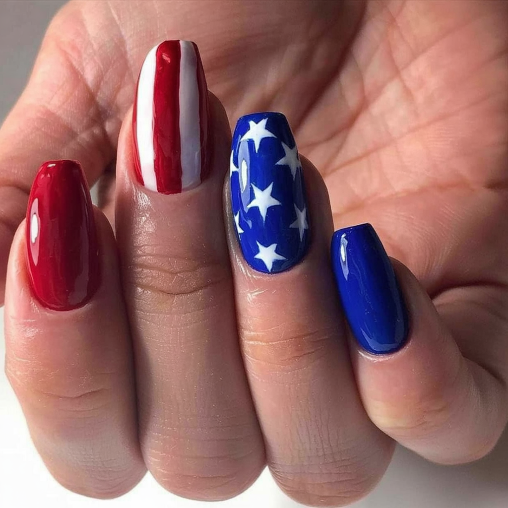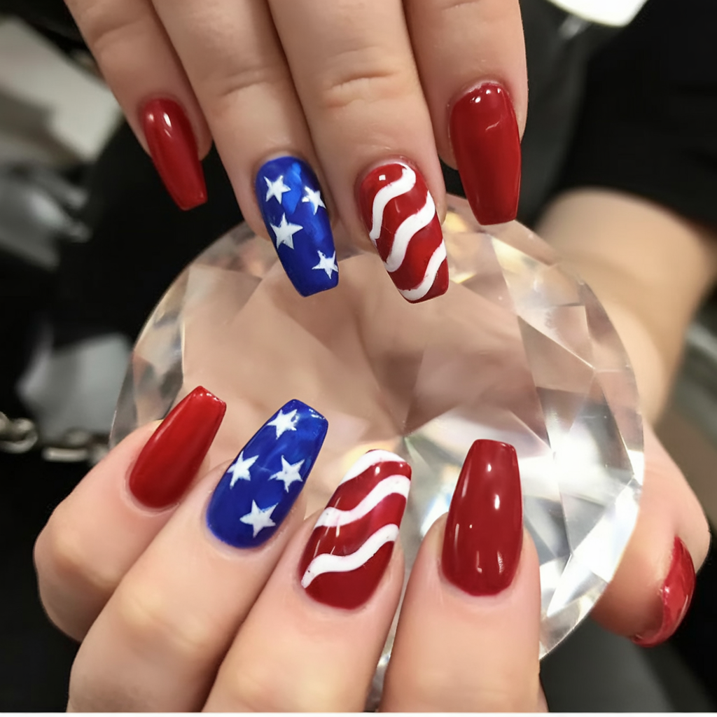This high-gloss acrylic look is made for the woman who owns every room she enters. Alternating between rich red, deep blue, and crisp white stars and wave-like stripes, this square nail shape design is pure patriotic elegance with a touch of Hollywood. If you’re headed to a luxe fireworks viewing or just want your nails to do all the talking, this one’s for you. Style it with a red jumpsuit, silver heels, and confidence to match.