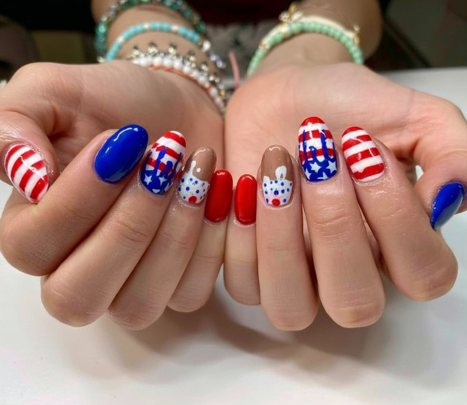 Imagine your grandma’s quilt, but make it fashion. This acrylic nail design is an explosion of ideas: plaid stars, red and blue floral prints, soft pastel touches—all wrapped into an artistic celebration of American heritage. The nail type here is slightly longer almond, making room for more elaborate art. A trendy mix of gel nails and hand-painted designs, these pair perfectly with a flared denim skirt and ruffled blouse for a modern vintage twist.