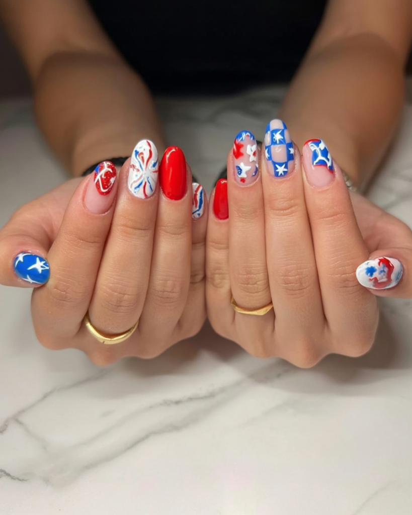 This look redefines the 4th of July french tip trend with elegant red and white swirls paired with a design simple nude base. Paired against deep blue nails splashed with bold white stars, this short square nail type offers the perfect harmony of modern sophistication and patriotic pride. Great for brunches or family BBQs, you can easily match these with a red tank top, high-waisted jeans, and bold hoops.
