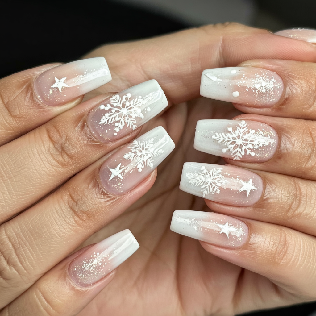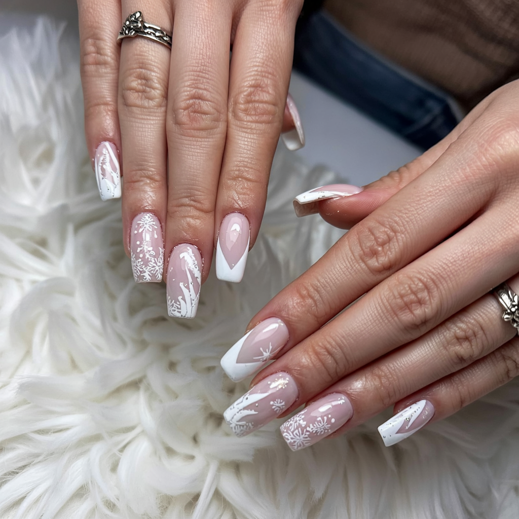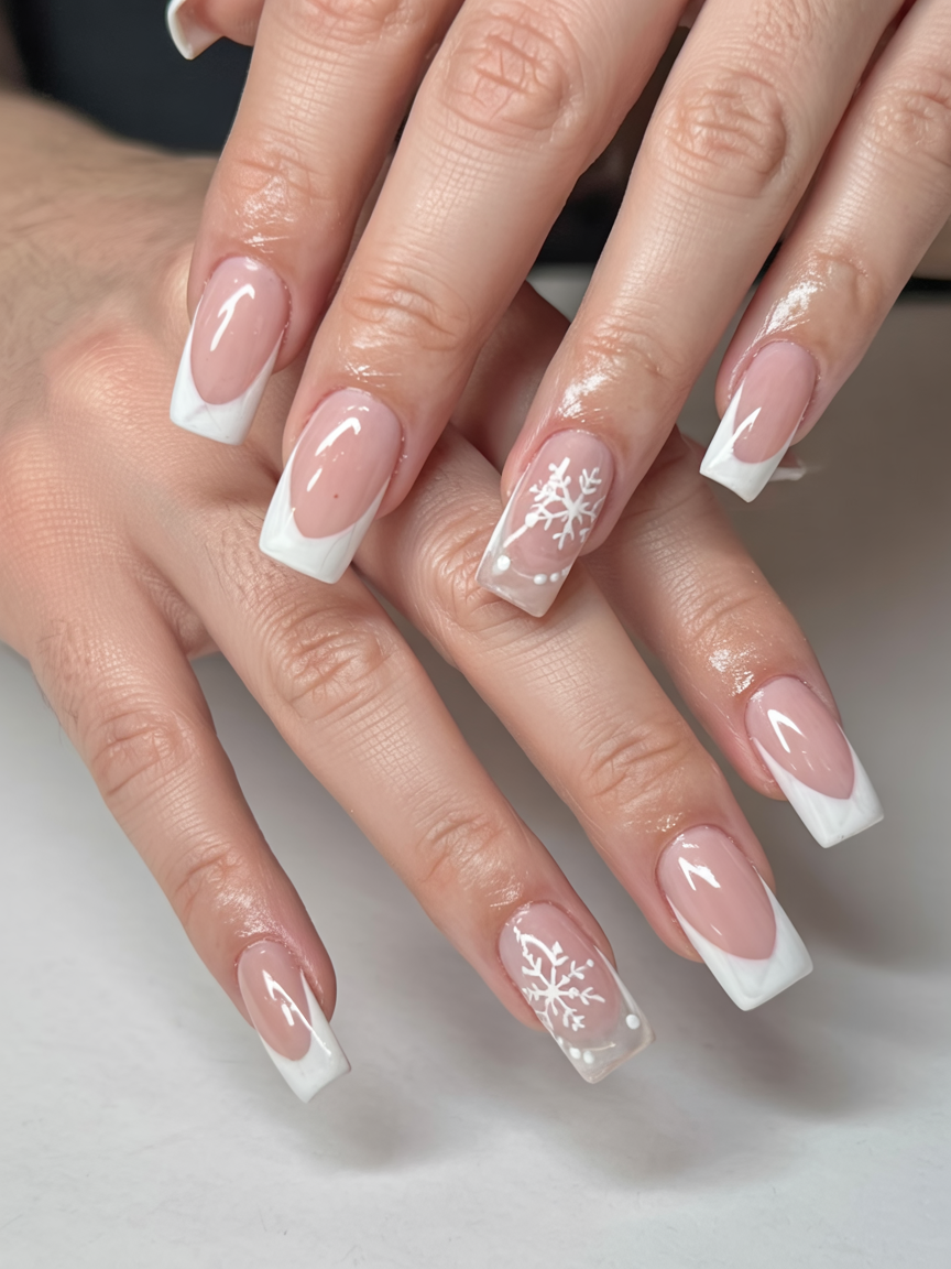For a talisman between chic and festive, this one is pure inspo. Square tips give a sense of elegance backed with a touch of delicate (read: not overbearing) snowflake art intertwined with the classic white French elements. The sheer nude base keeps it light and classy, while the snowflakes whisper Christmas without overstepping on the look.