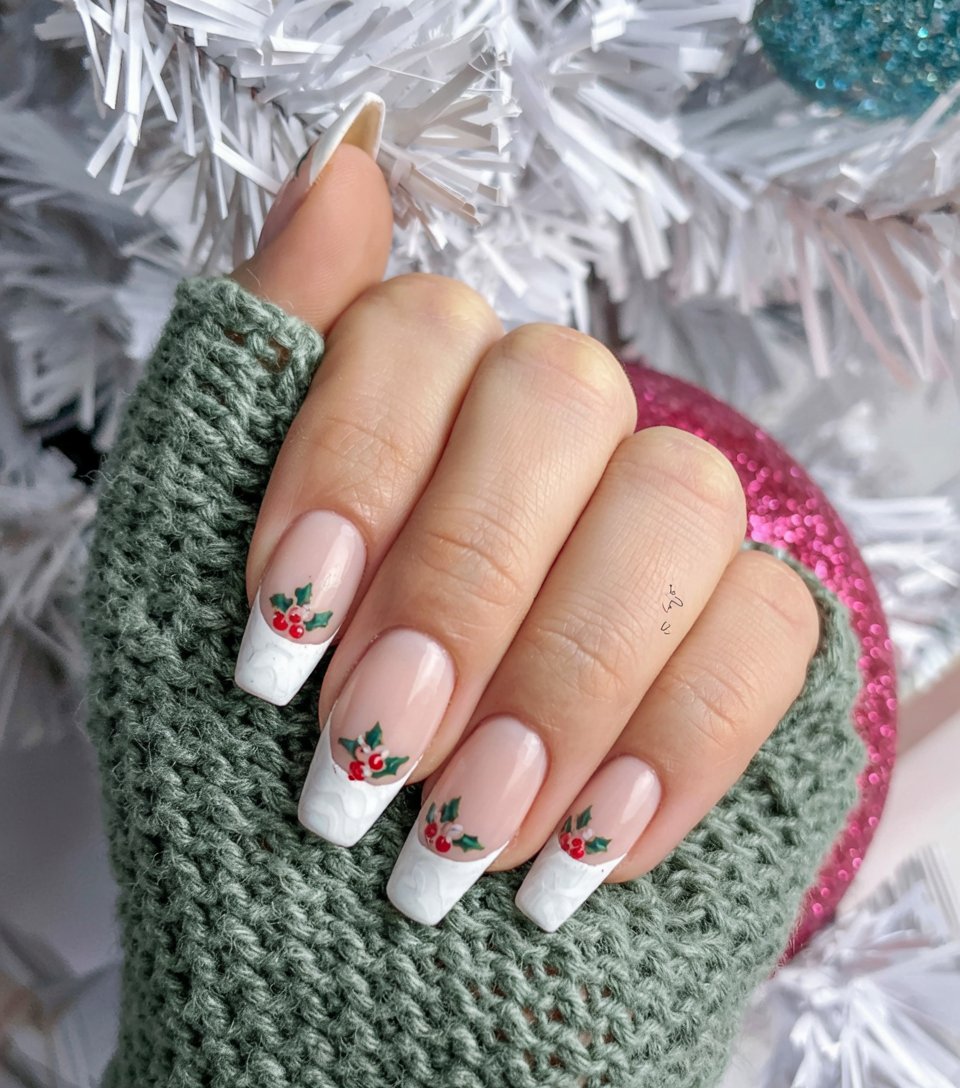 This classic take on French tips features holly berry art in red and green hues over a base of stark white. It feels fresh and fun, absolutely perfect for Christmas yet a little bit understated. The clean lines’ juxtaposition to the holiday-themed artwork makes it just right for those who want their nails festive yet elegant.