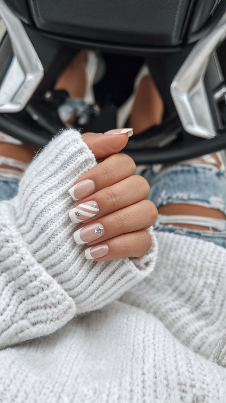 This set takes the French manicure and upgrades it for Christmas with candy cane stripes and tiny star accents. It’s chic and modern while keeping that cozy holiday vibe. The clear base makes the white details stand out beautifully, giving a crisp and fresh look.