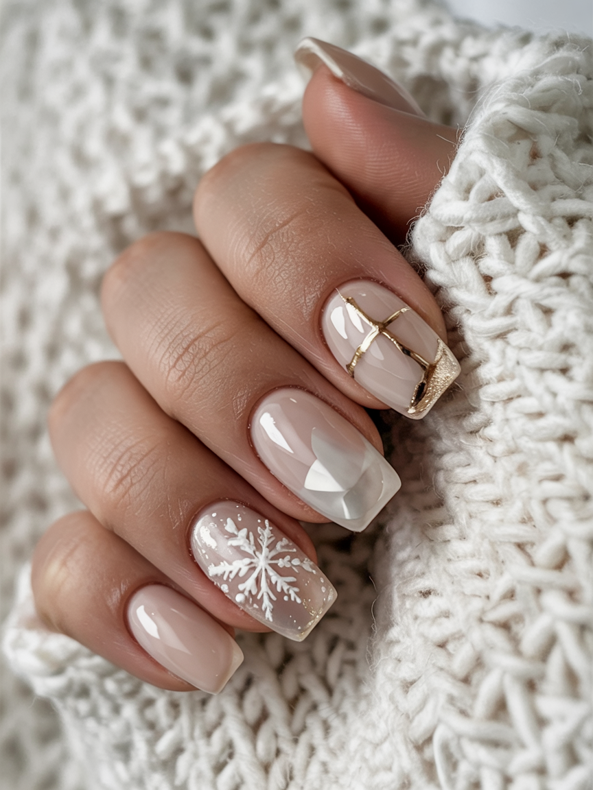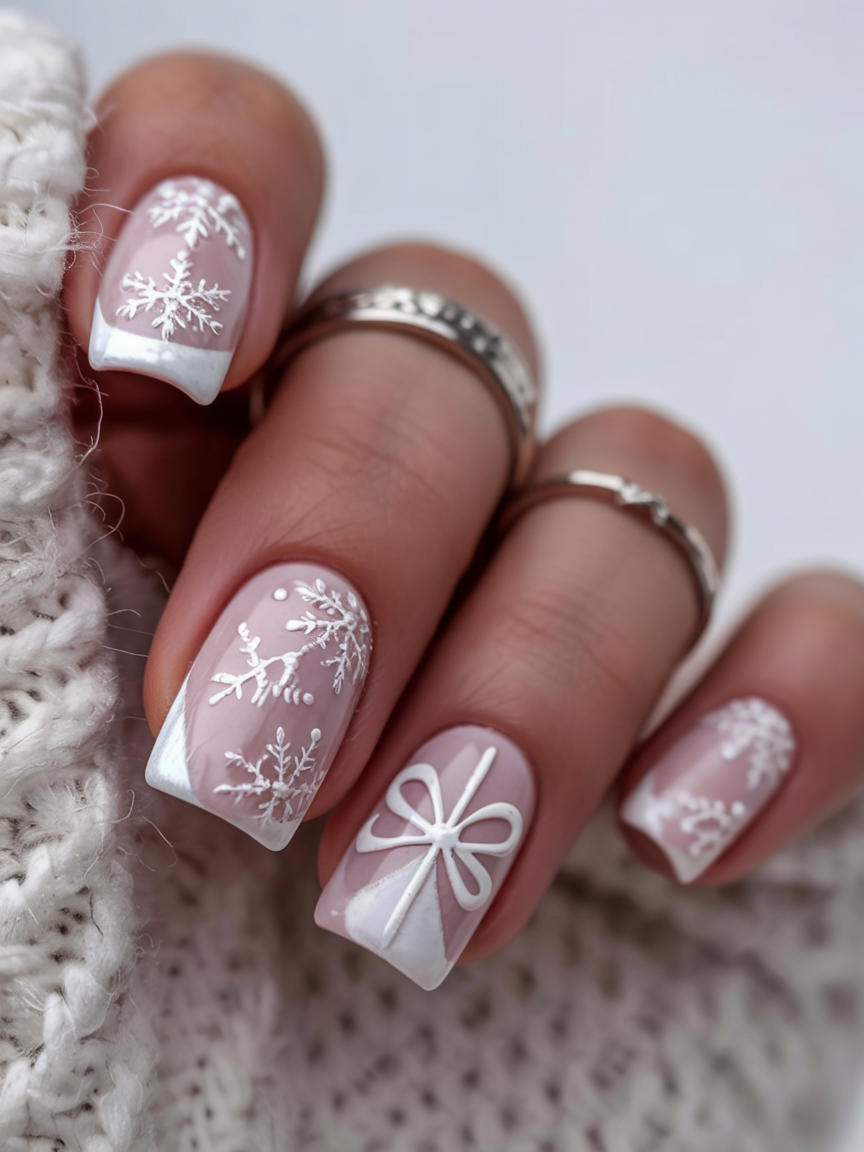 Like tiny wrapped presents, these nails feature crisp white bows and snowflakes over a soft nude base. It’s elegant yet festive, making your manicure feel like part of the holiday décor.