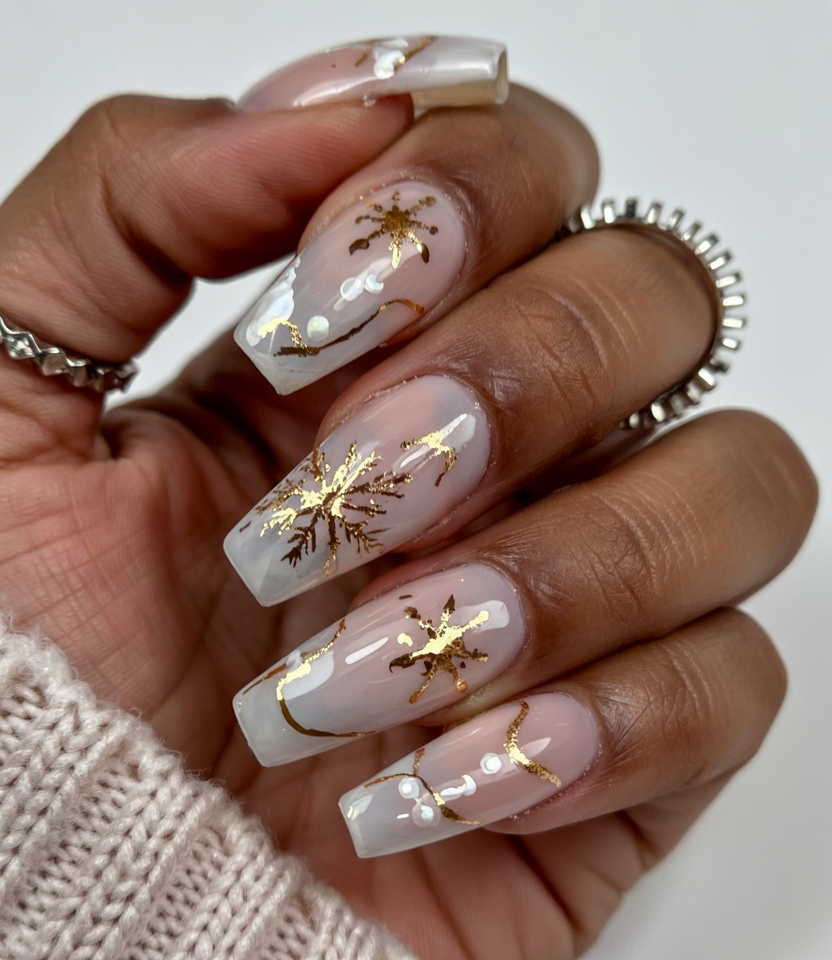 Seriously, nothing can probably go so classy for the holidays than gold and white. This manicure was intended to set the mood with classy golden snowflakes that shimmer on a glossy base, maintaining a glamorous and festive tone.
