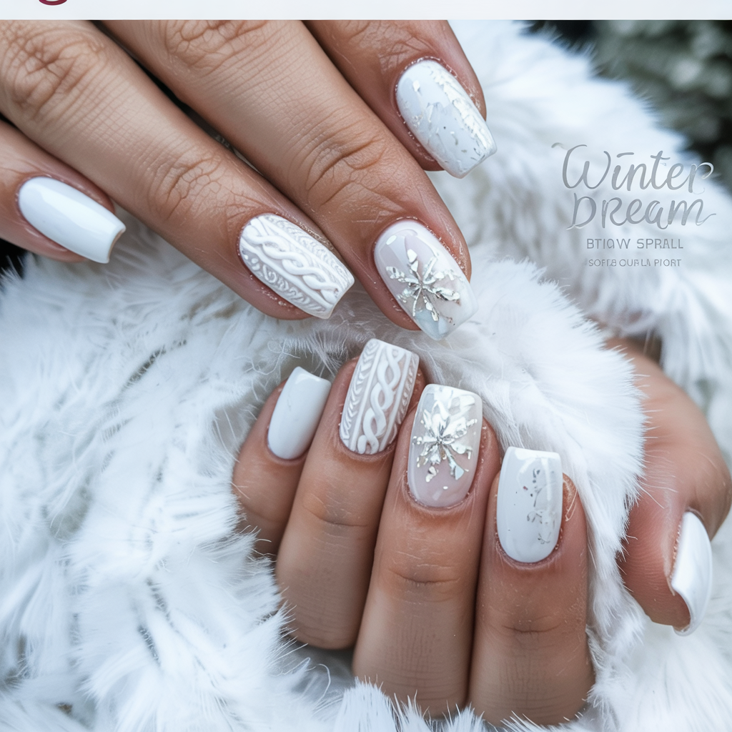 This set is like winter coziness wrapped up in nail art form. The combination of glossy white polish, cable-knit texture, and snowflake accents makes your nails feel like a chic accessory for the season. The design balances cute details with a trendy 2025 vibe, making it both modern and festive.