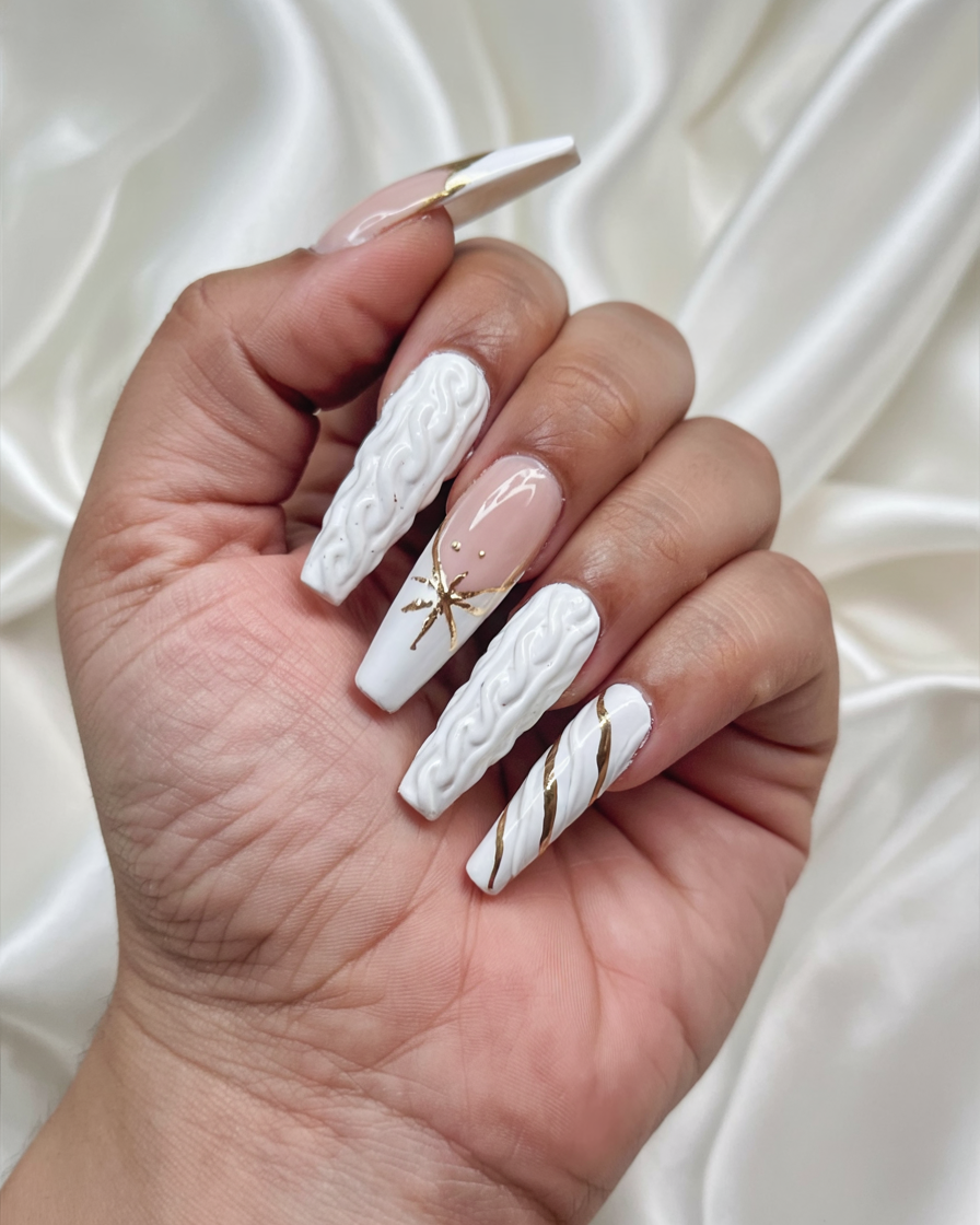 A luxurious twist on glossy white polish, this design offers a bit of Gaelic gold with accents and full sweater textures. The metallic gold lines and starburst designs lure one into looking at them instantly, imparting a glitz-for-the-holidays glow onto your nails. Don`t misread: It`s a chic way to instill sparkle into your look sans glitter.