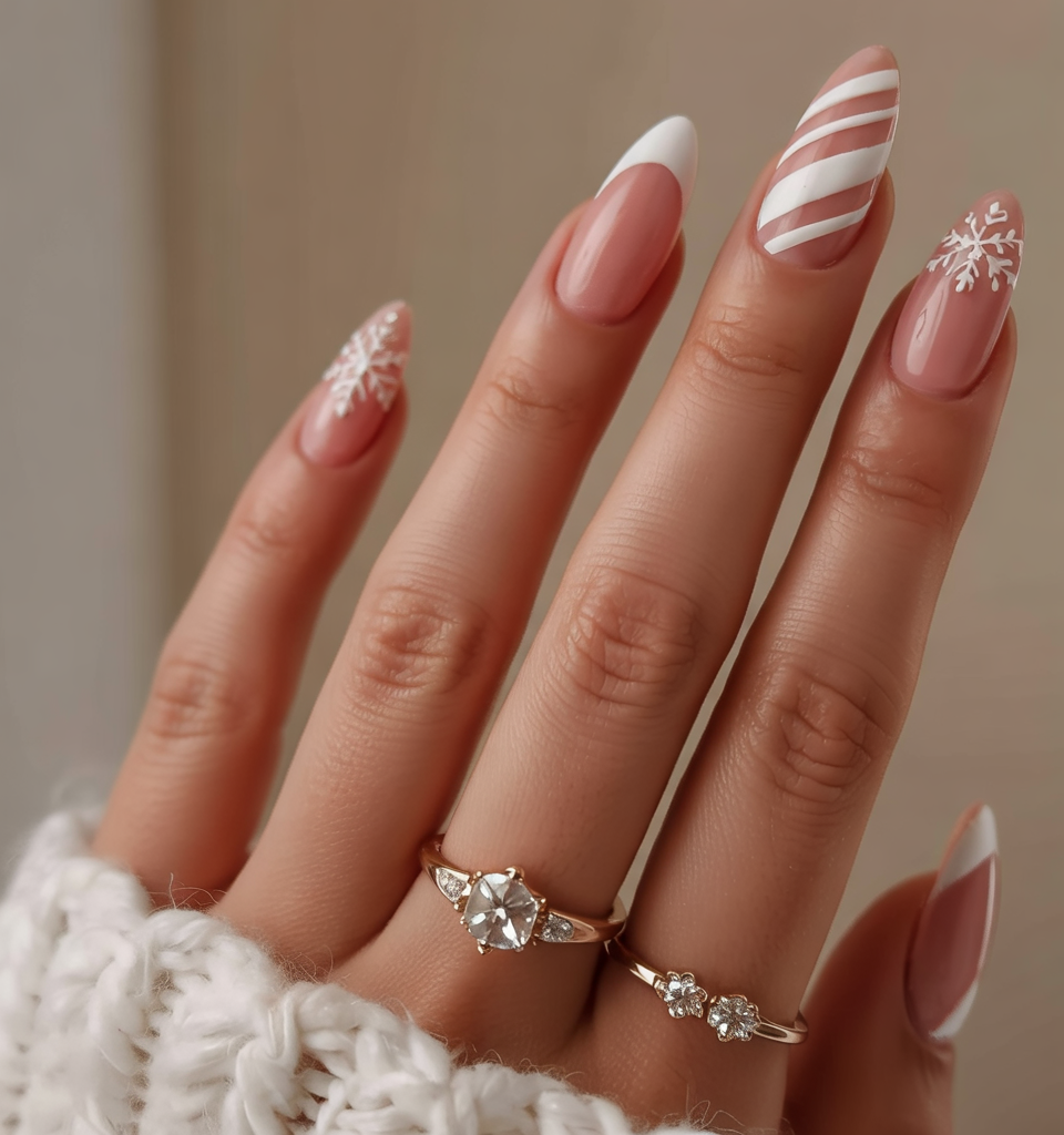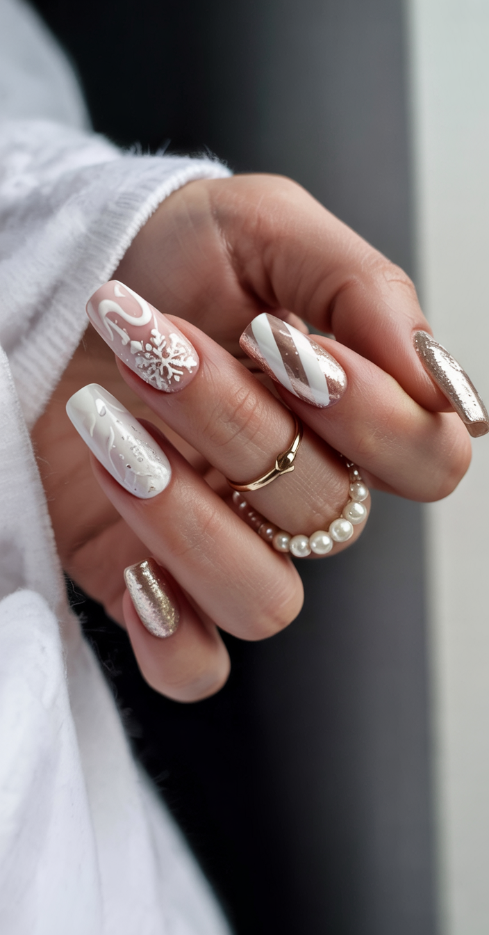 A lovely combination of rose gold and white goes forth and beyond into candy cane stripes, snowflakes, and a metallic glow. This blend feels fresh, on-trend, and while playful, would make your nails the perfect accent for your outfit.