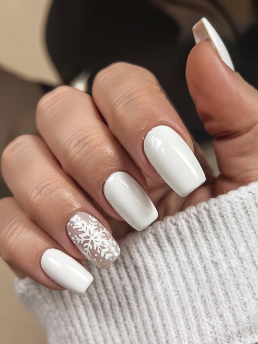 Sometimes less is more when it comes to stylish. The clean fresh white polish with one single snowflake accent nail makes a strong yet minimalistic statement. The kind of manicure that feels crisp, modern, and perfect for effortless styling in winter.