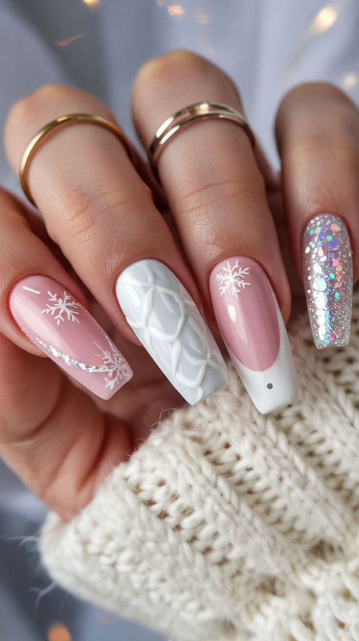 This design uses more shades of pink, white snowflakes, and knit textures, accompanied by a sparkling accent nail for an extra dose of holiday spirit. So fun, feminine, and full of character—just the kind of nails to celebrate and remind you of the joyful side of Christmas.