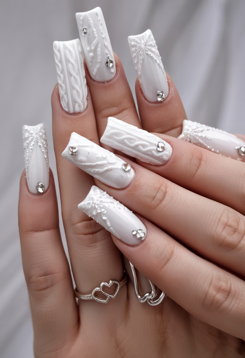 Those coffin nails are winter-cruel-du-wishes, mixing glossy-white polish with cozy sweater textures and subtle flashes of rhinestones. The 3D knit patterns give depth and warmth, almost like your favorite cable-knit sweater was reinterpreted as nail art. This is a bold and silly take on your classic jewel nails, especially if you like your nails to be the center of attention from your face down.