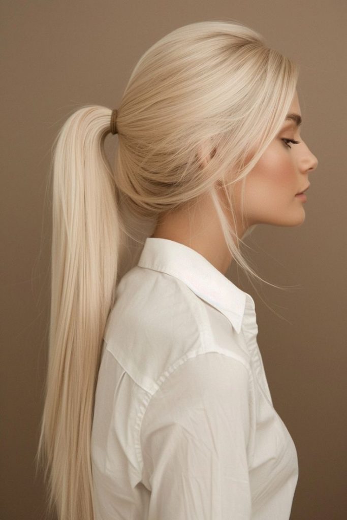 This sleek blonde ponytail is the definition of minimalist elegance. The smooth finish and subtle shine make it a perfect option for both professional settings and casual outings. The long hair is gathered neatly, showcasing the soft blonde hue in all its glory. This style is incredibly versatile, working well with anything from a crisp white shirt to a chunky sweater. The sleekness of the ponytail keeps the look polished, while the bright blonde color adds a touch of warmth to the cold winter months.