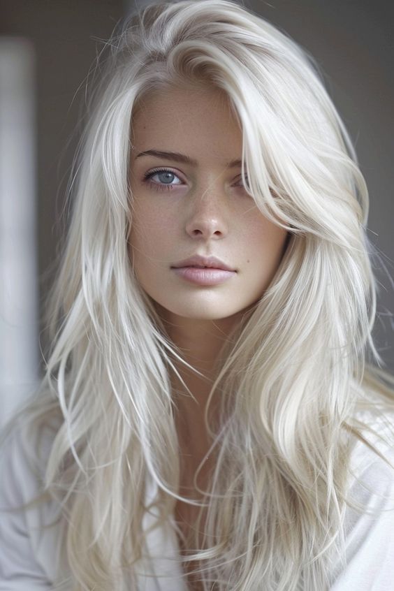 This snow-white blonde is as cool as the winter air itself. The color is almost ethereal, with the soft part adding a touch of classic elegance. Ideal for long hair, this look is both striking and serene, making it perfect for the winter months. The light, airy texture gives it a youthful vibe, while the bold white shade ensures you’ll stand out in any setting. This style works well with both casual and formal outfits, offering versatility and beauty in one chic package. The cool tones of the hair are perfectly suited to the winter season, reflecting the frosty landscapes outside.