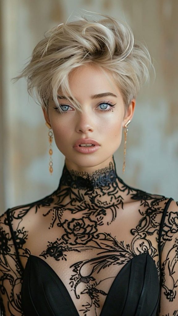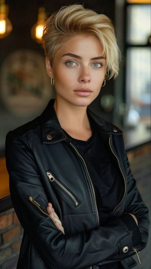 For the fashion-forward, this edgy blonde pixie with an undercut is the ultimate winter statement. The short hair cut is sharp and bold, with the undercut adding an extra layer of cool. The platinum blonde color is bright and icy, making it perfect for those who want a look that’s as crisp as the winter air. This style is not for the faint of heart, but for those who can pull it off, it’s a surefire way to stand out. Whether you’re hitting the slopes or the city streets, this look is guaranteed to make an impact.