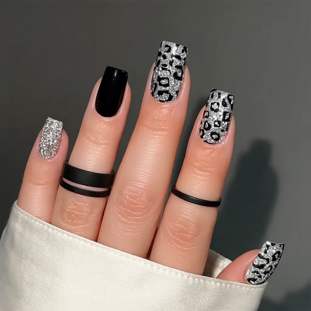 This set feels like a little black dress… but make it nails. The matte black brings that sleek, grown-up edge, while the silver leopard glitter is pure party energy—sparkly, bold, and honestly kind of addictive to stare at. It’s glamorous without being fussy, and the contrast makes the whole design look extra sharp and expensive. If you want animal print with a “night-out” finish, this is the one.