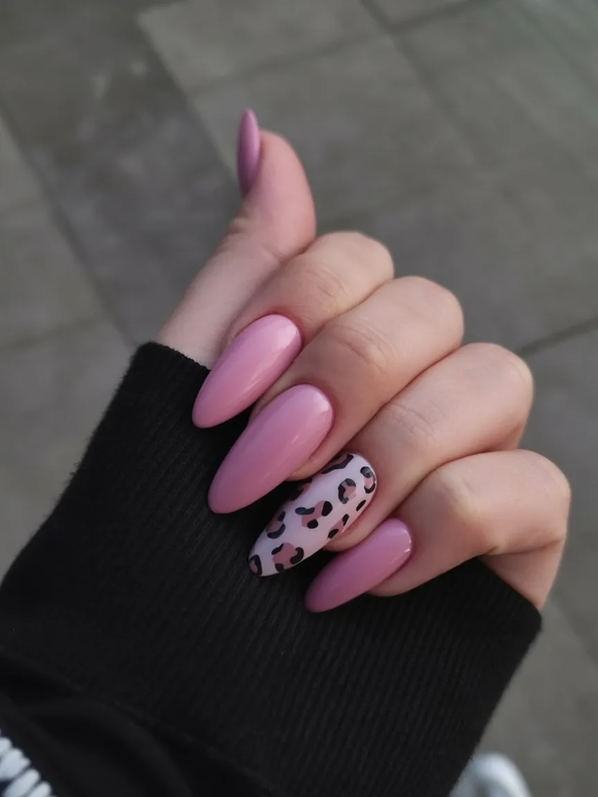 This is that effortless “pretty girl” manicure that never goes out of style. The soft pink looks clean and romantic, and the leopard accent gives it just enough spice to feel modern. It’s subtle but not boring—like a simple outfit with great jewelry. If you like nails that feel feminine but still a little bold, this one is a sweet spot.