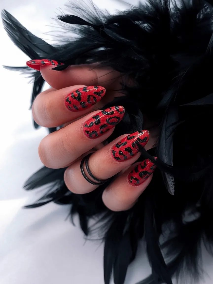 For a low-fuss version that still hits hard, keep the nails one consistent shape (almond works beautifully) and use one red tone for the base across all nails. Then add leopard spots in black with slightly glossy contrast so the pattern shows clearly. Because red can fade faster, ask for a UV-protecting top coat and avoid hot water the first day. This is an easy way to wear red energy without needing extra accessories.