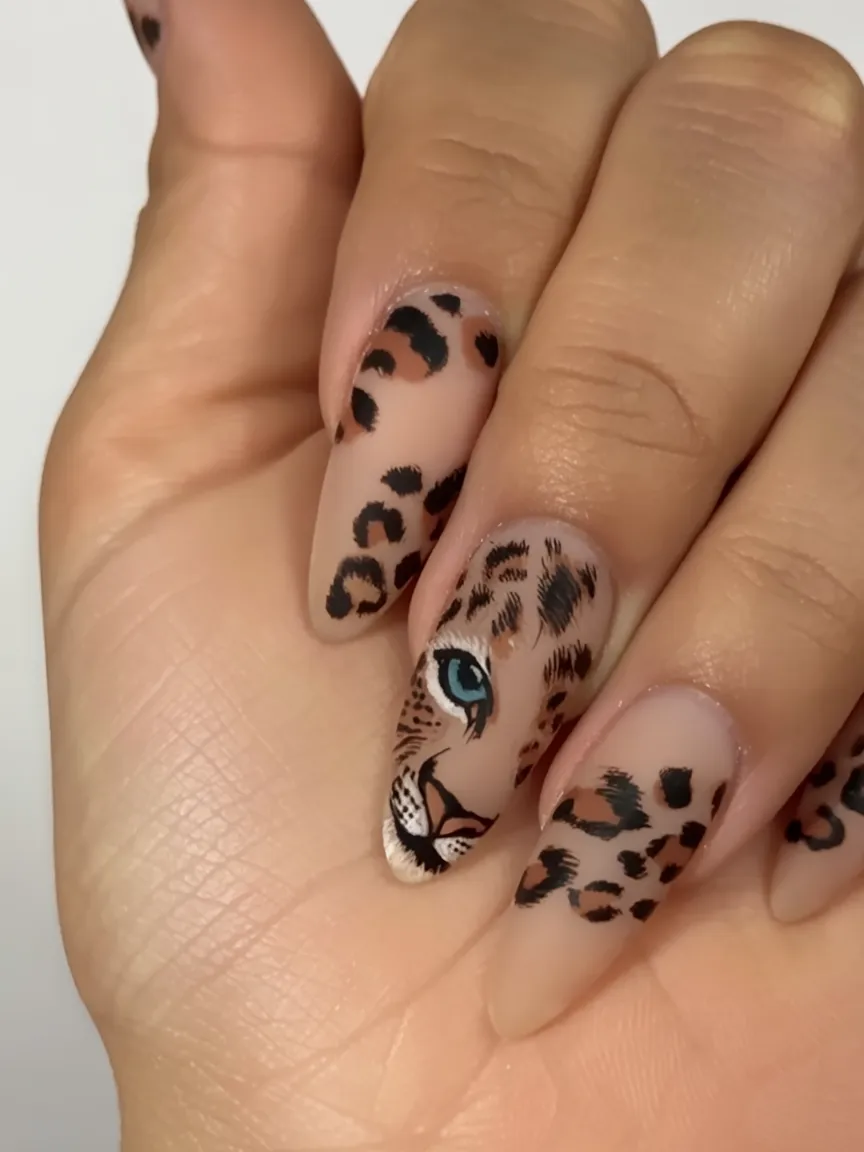 This manicure is wild in the most elegant way. The soft nude base feels classy and wearable, but the leopard pattern and the detailed cat-inspired art turn it into a true conversation piece. It’s dramatic without being flashy, like a bold lipstick with a neutral outfit. If you love animal prints but you want something more creative than the usual spots, this is the upgrade.