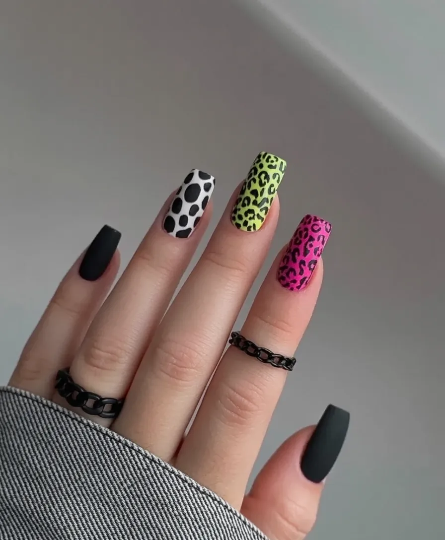 This one is pure attitude—in the best way. Matte black gives that sleek, modern base, and then the Neon animal prints come in like a fun little shock of personality. It feels bold, a bit Y2K, and honestly kind of addictive if you’re tired of “safe” nails. The contrast makes the whole look feel like a statement accessory, even if your outfit is super simple.