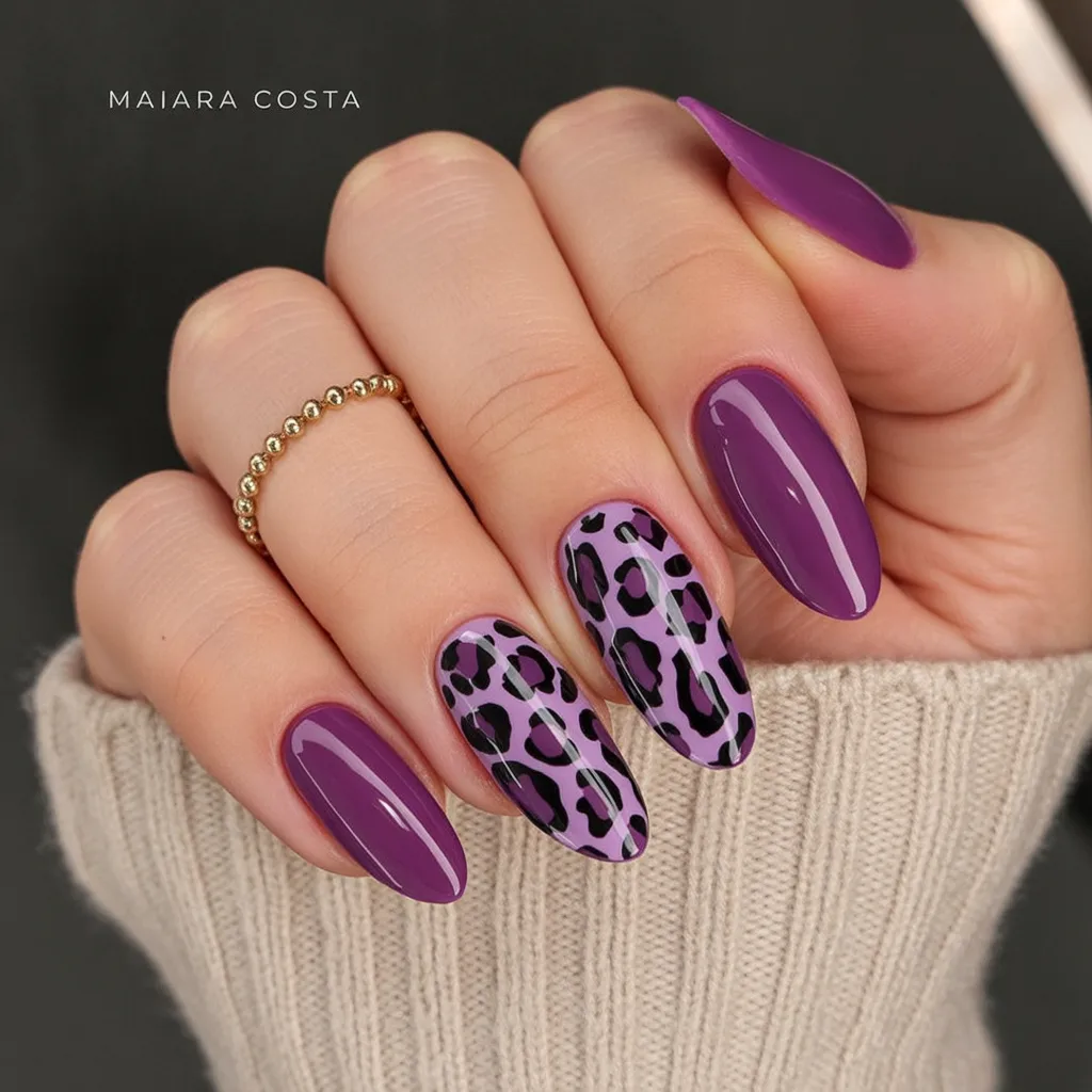 For the cleanest result, keep the almond shape slightly rounded and ask for two thin coats of Purple for an even finish. On the accent nails, use a sheer nude base and build the leopard spots with black and tiny touches of Purple so the pattern looks intentional, not heavy. Finish with a high-gloss top coat and cap the free edge to help prevent chips—this design stays crisp longer when the shine is sealed properly.