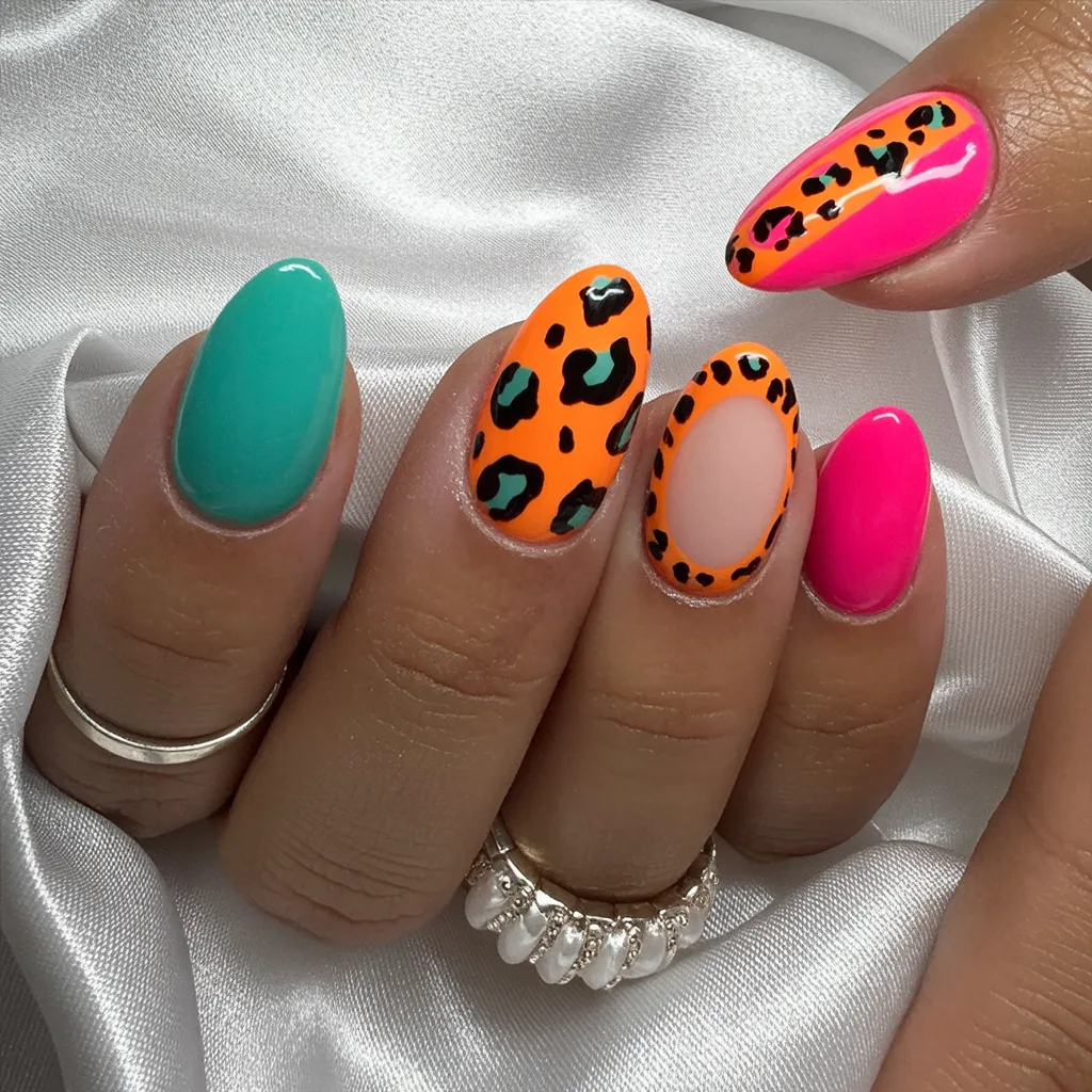 Best for almond nails because the shape keeps Neon colors looking elegant instead of harsh. If you’re adding crystals, place them in a slim line down the center of one accent nail so it stays chic and doesn’t snag. Use a strong gem adhesive and seal around (not over) the stones with top coat. This design is great for anyone who wants leopard art with a little extra glamour, without going overboard.