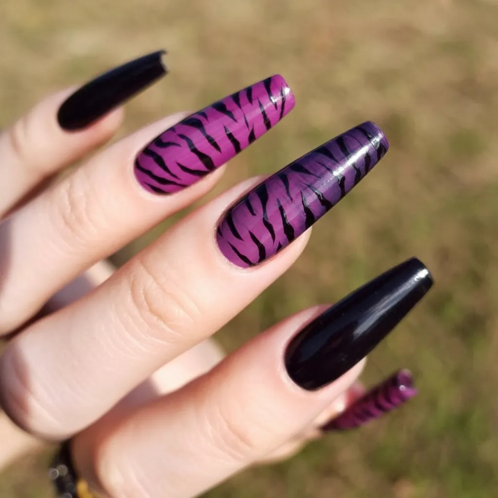 This design works best on long nails so the stripes have space to flow (coffin shapes look especially clean here). Ask for a solid black on a couple of nails, then a purple base on the patterned ones with black stripe art layered on top. Keep the lines slightly curved so it reads as animal print, not random scribbles. If you love bold nails but want them to still feel polished, make sure the top coat is ultra glossy and the pattern edges are crisp.