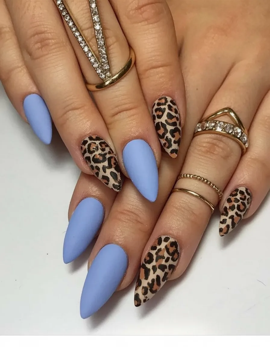 6. Matte Blue and Leopard Mix for a Soft-Edgy Look