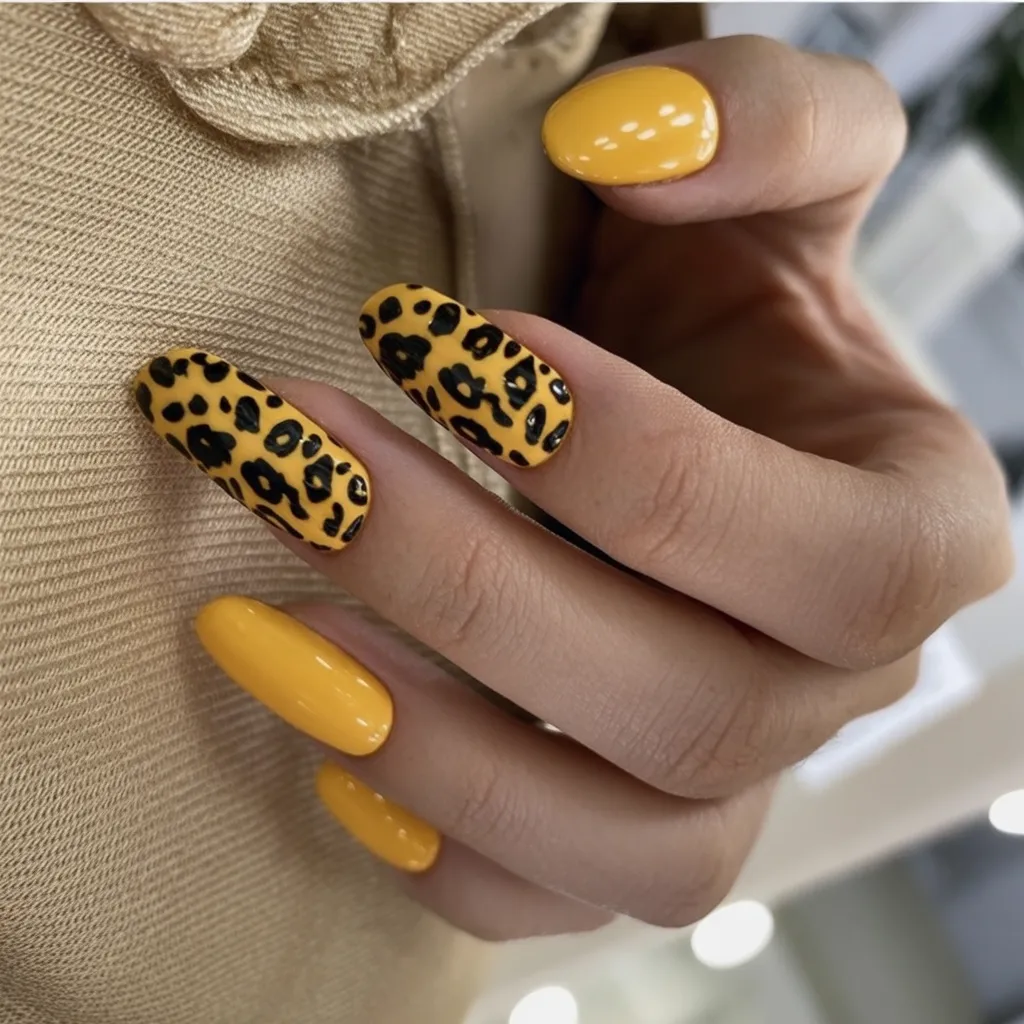 If you want nails that look instantly styled with minimal effort, this is a strong pick. Oval or almond shapes flatter most hands and make bold shades feel softer. For the leopard, keep the base matching the yellow family and add black spots with a fine brush so the print stays crisp, not muddy. This design works especially well if your wardrobe leans neutral—your nails become the accessory, and everything else gets to stay simple.
