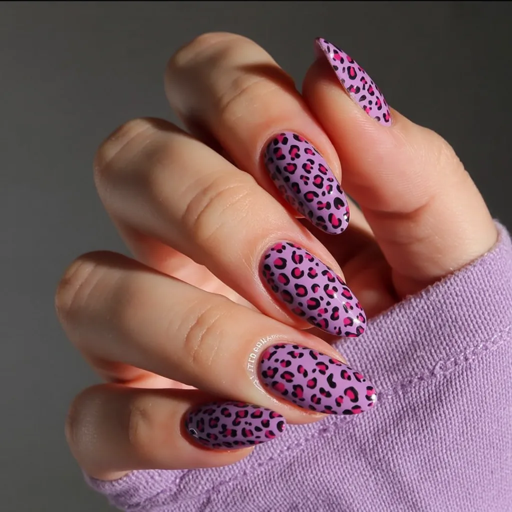These Ideas shine on medium-length almond nails because the shape elongates the fingers and gives the print room to look clean. Ask for a solid purple on most nails, then choose one or two accent nails with leopard in a lighter base to create contrast. Keep the spots black and slightly oversized for a modern look. If you’re into current trends, this kind of bold-solid + print-accent combo is exactly the “minimal effort, maximum impact” direction 2026 nails are leaning toward.