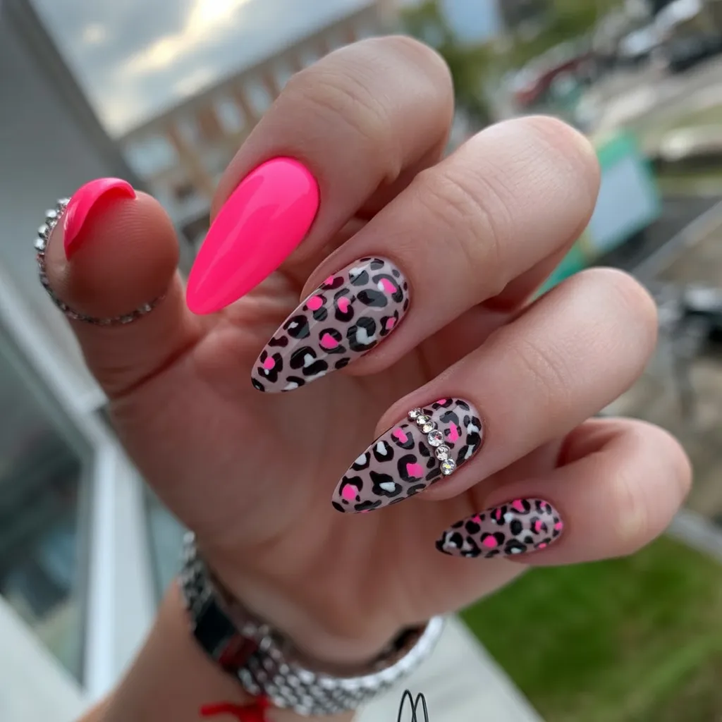 19. Neon Pink Leopard Almond Nails with Crystal Detail