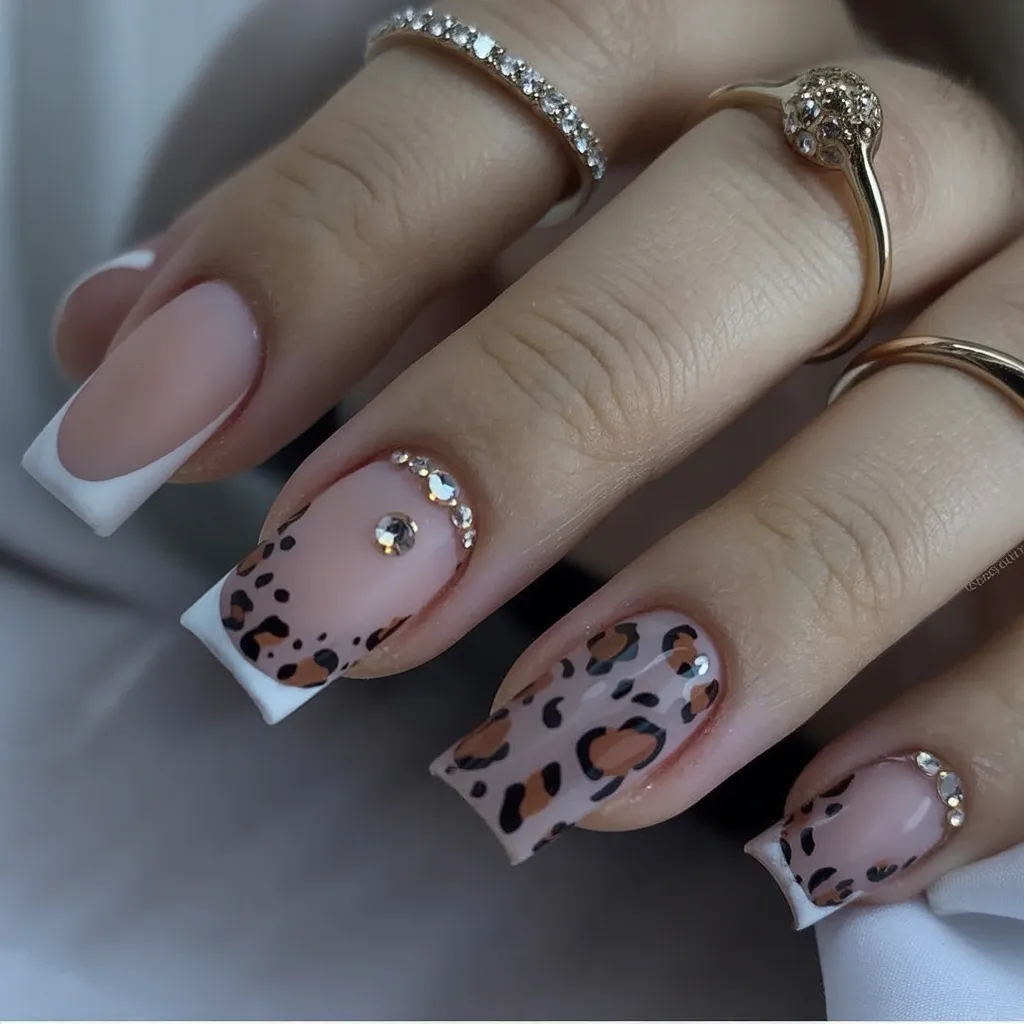 Perfect for square nails, especially if you like a neat, structured shape. Ask for a sheer nude base that matches your skin tone and a crisp White French tip, then add leopard print on one or two nails (or as a corner detail) to keep it refined. The crystals should be minimal—one cluster near the cuticle is plenty—and sealed well so they don’t snag. This is a smart choice if you want a design that works for office days, events, and everything in between.