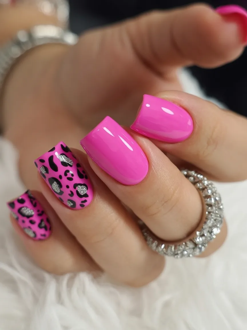 Best for short-to-medium nails in a clean square shape, especially if you like bold color but want the look to stay wearable. Ask for a crisp, even coat of neon pink on most nails, then add leopard spots on one or two as the statement. Keep the spots slightly varied for a more natural art look, and finish with a thick top coat for that glassy shine. It’s a great summer Inspo choice when you want bright but not chaotic.