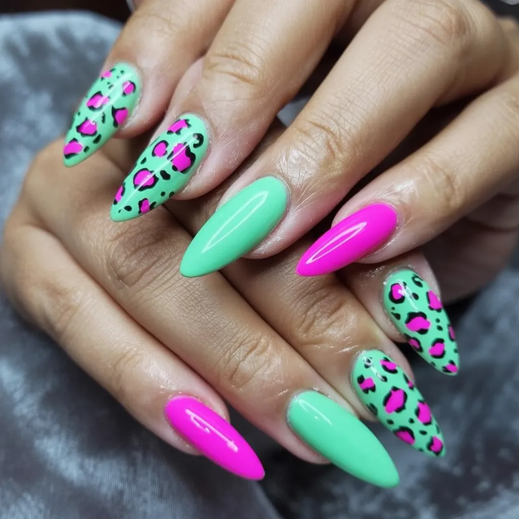 18. Green and Neon Pink Leopard Nails with Pop Contrast