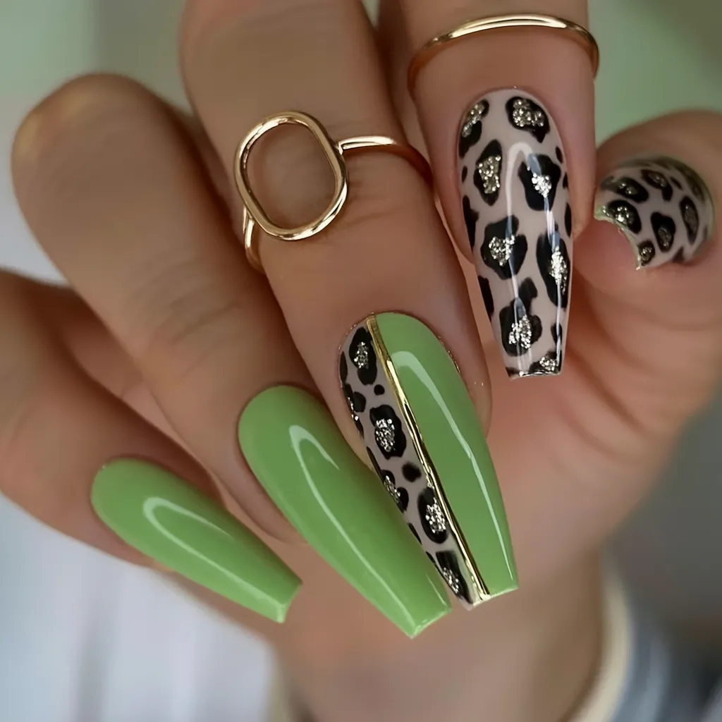 Best for long nails so the stripe detail looks sleek (coffin or tapered square works beautifully). Ask for a solid green on most nails, then choose one accent nail with a leopard stripe running lengthwise; it elongates the nail and looks very intentional. Seal the metallic line under a smooth topcoat so it doesn’t lift. If you want the emotional payoff of “new season, new me,” this is an easy switch that feels instantly updated for 2026.