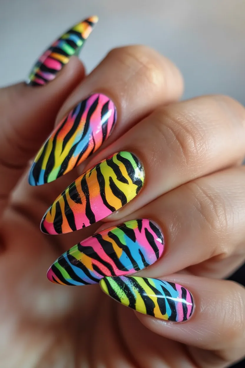 22. Colorful Zebra Neon Nails for a Bold 2026 Statement