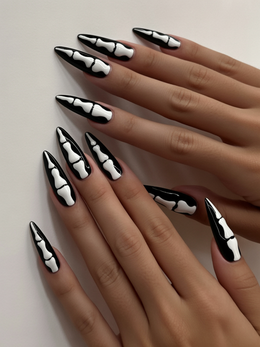 These nails take skeleton art to a sleek new level. Black is the base color down to the stiletto center, cut halfway through and half bone pattern in clean white. Minimalist meets striking in this bold, graphic combination that screams for anyone with a simple goth vibe demanding high visual energy.