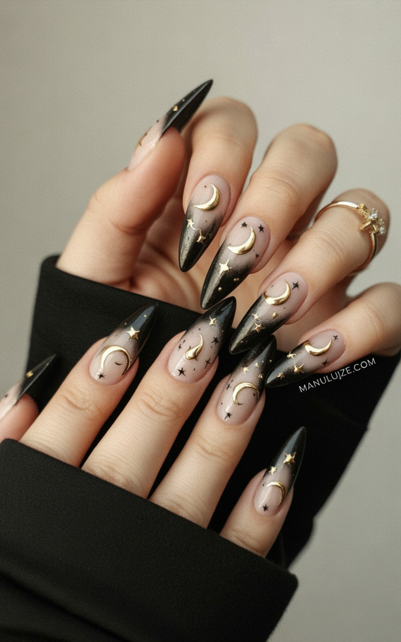 There’s something stunningly fascinating about goth nails with a celestial theme. Golden moons and stars shimmer over smoky Black ombré tips for a look that is romantic, secretive, and mildly enchanted. It is the subtle elegance of soft goth with a dreamy cosmic essence.