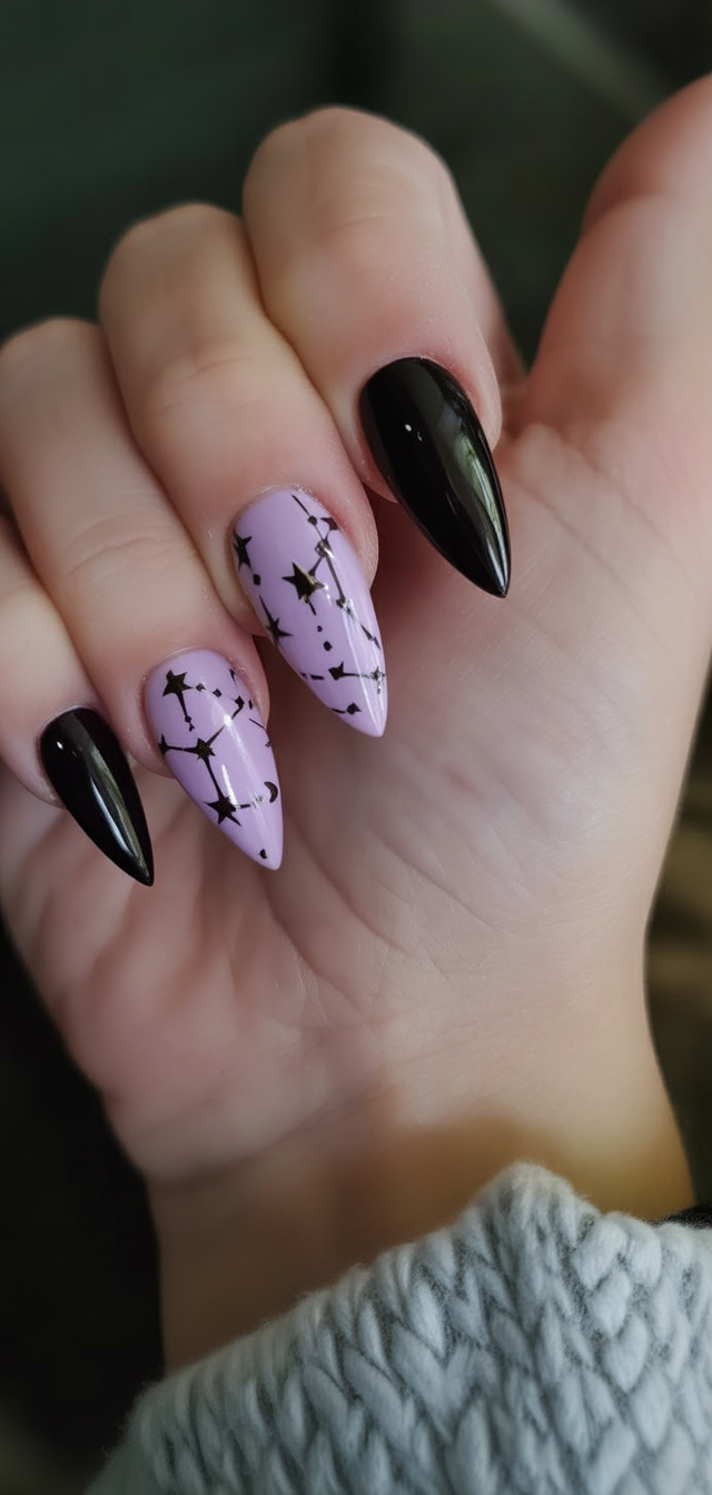 These nails soften the goth aesthetic with a dreamy twist — soft lavender combined with Black accents and constellation patterns. It’s celestial yet approachable, perfect for those who love to mix darkness with sweetness. The star patterns create a delicate yet mystical look.