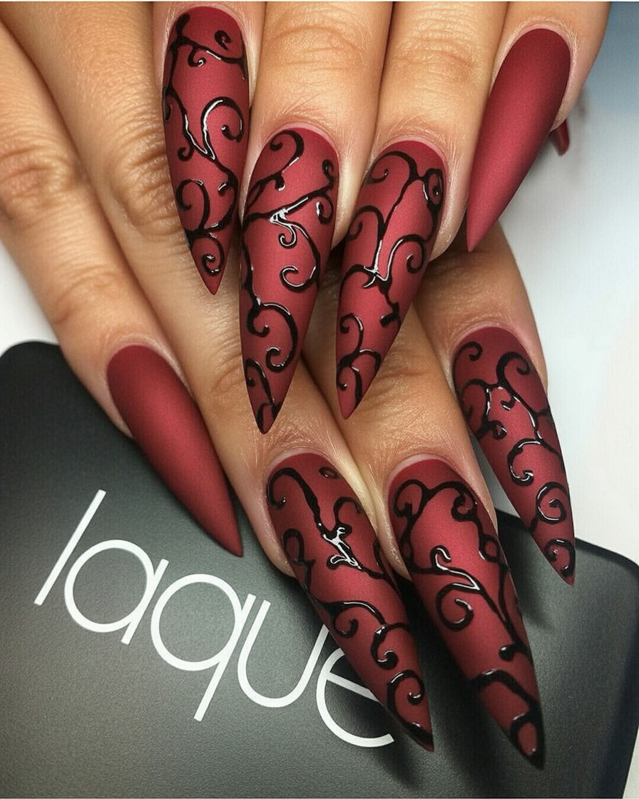 These matte burgundy nails embody pure gothic romance. The velvety finish paired with glossy black scrolls creates an enchanting contrast that feels regal yet mysterious. It’s the kind of design that looks like it belongs in a dark fairytale — elegant, passionate, and powerful. The deep Red tone gives off an aura of quiet confidence and old-world glamour.