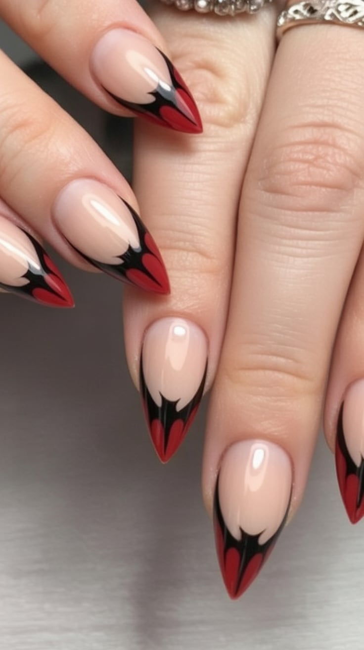 The nude base keeps it classy; dramatic red and black tips introduce attitude. It is sexy and confident, really for anyone who is into that sophisticated yet edgy kind of design.