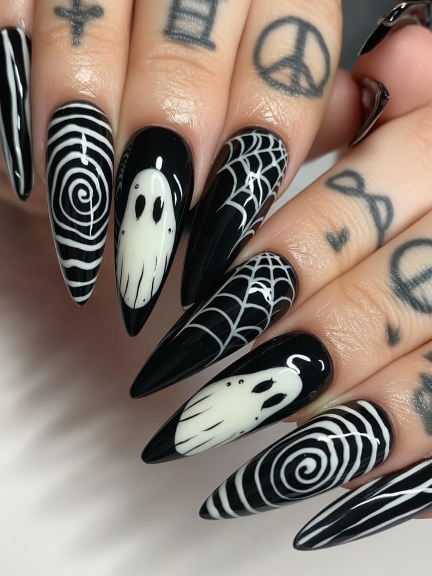 Totally ragged nails: serpent patterns, ghostly faces, and web designs under mixture of gloss Black. It’s a salute to glamor that contains unwanted vibes, yet it actually goes all the way in capturing whimsical goth Art with an edge. The set of pure whites and midnight blacks adds immediate drama that attracts attention.