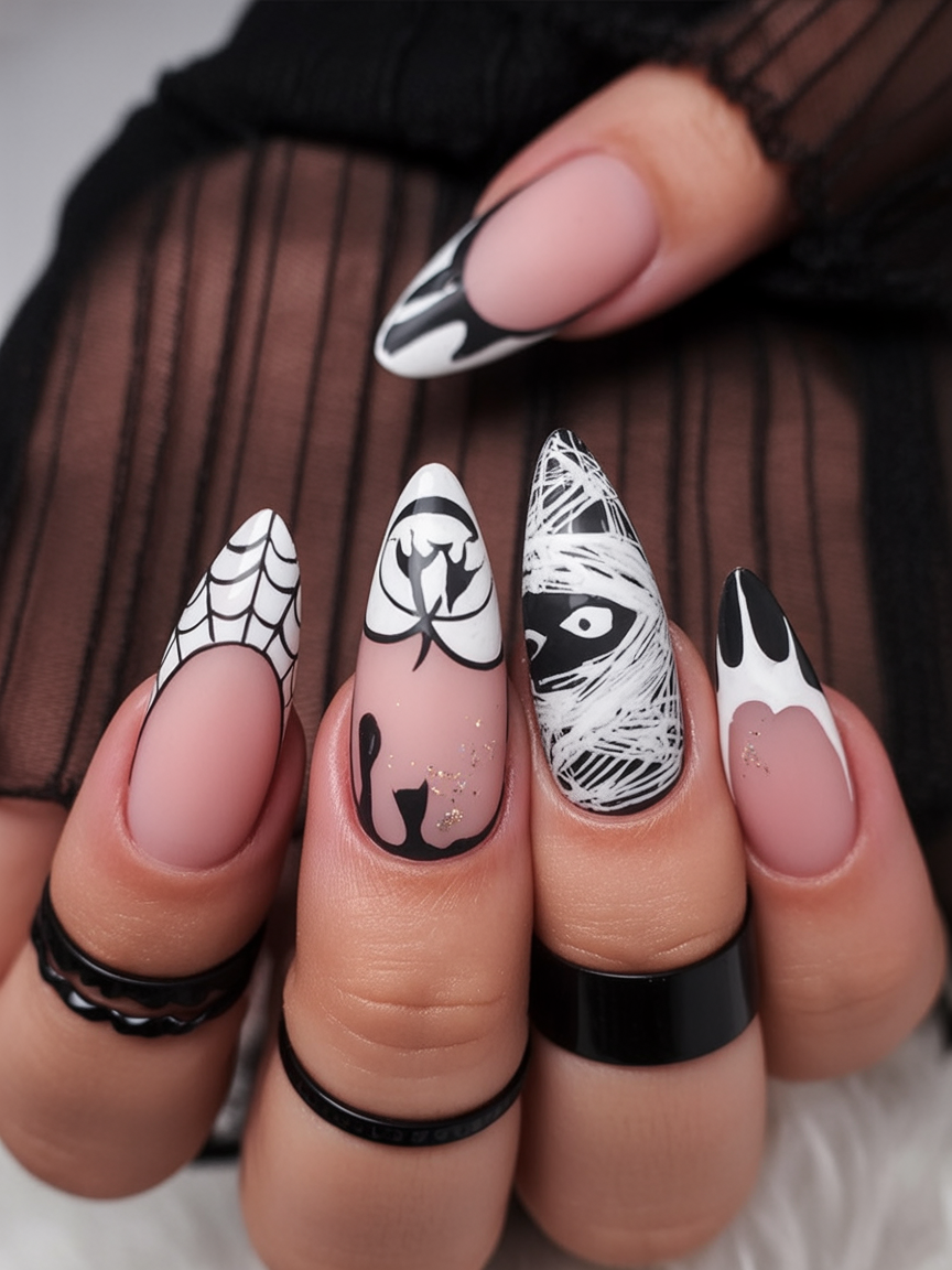 This playful but Dark nail art brings about some mystery and fun. The blend of matte and glossy finishes, featuring spiderwebs, a black cat, and graphic lines, gives it a unique flair. The ultimate gothic whimsy-gorgeously dramatic yet cute and full of character!