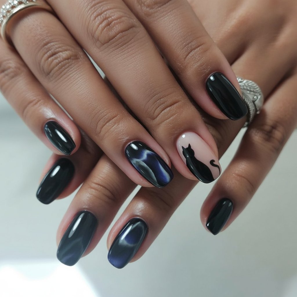 Ideal for ladies preferring short square nails, this design remains a beautiful combination of beautiful and functional. It is good for daily use but especially full of character. The cat motif lends a cute edge that works well all year around, mainly in Fall and Winter seasons. It’s a low-key chic way to channel gothic inspo.