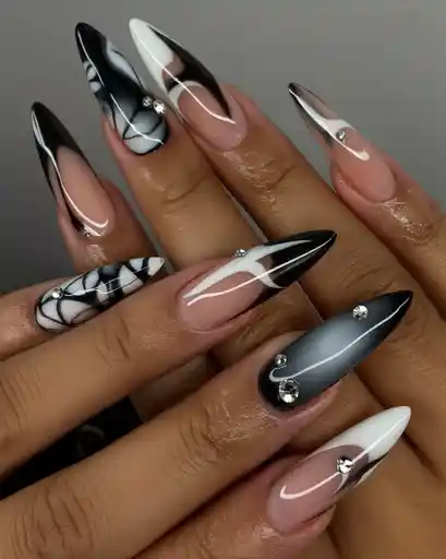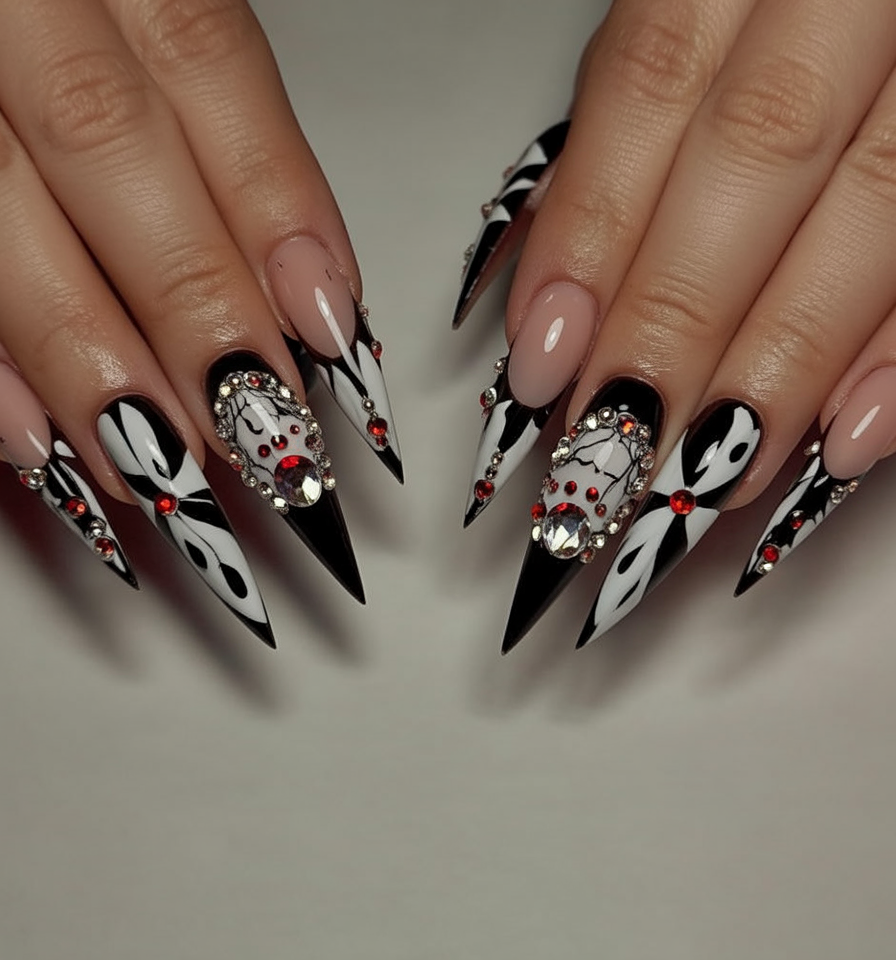 If you love drama, this one’s for you. These long, pointed nails combine black-and-white swirls with bold rhinestones and tiny red gems for a vampy, luxe aesthetic. The mix of shine, structure, and sparkle gives them undeniable star power — pure gothic glamour.