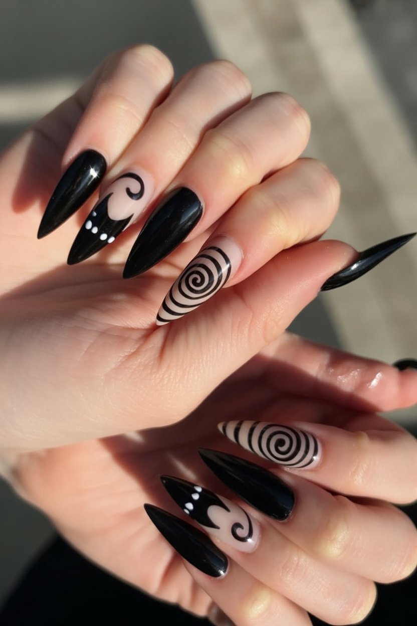 This design is best for almond or medium stiletto shapes. It is easy to recreate with gel polish and a thin brush, making it a good choice for those who like to go with an easy option. The design swirls offer a great visual interest without being too loud, making it a wonderful option for somebody who is delving into simple yet arty goth ideas.