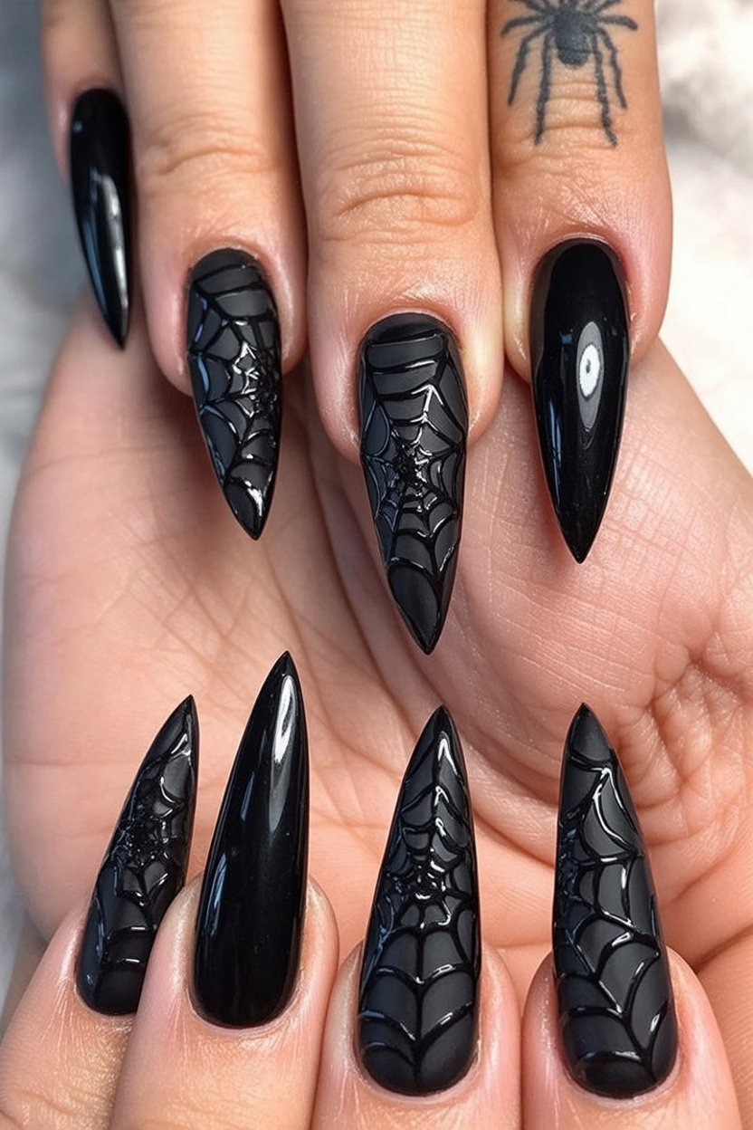 Classic and dramatic, these glossy black nails with raised web designs are one of the staples in goth nail art. They are sleek, bold, and effortlessly cool-all reminders that simplicity can still make a statement. The 3D texture provides an artistic vibe while keeping it monochromatic and modern.